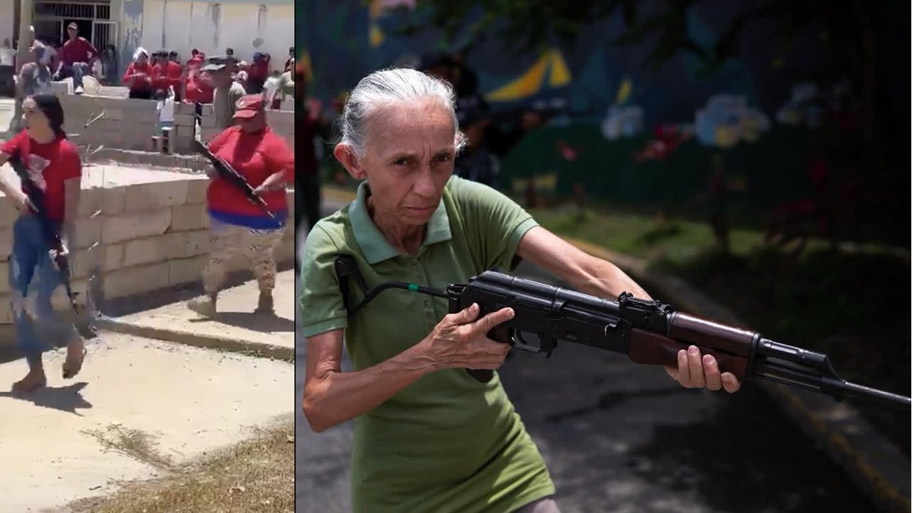 En el video, se ve como amas de casa, empleados públicos, trabajadores y militantes del PSUV fueron los encargados de empuñar armas desde el pasado fin de semana, atendiendo la orden dada por el narcotirano Nicolás Maduro, sobre presuntamente preparar al pueblo ante lo, a su juicio, es una amenaza militar de EE. UU. contra el país.