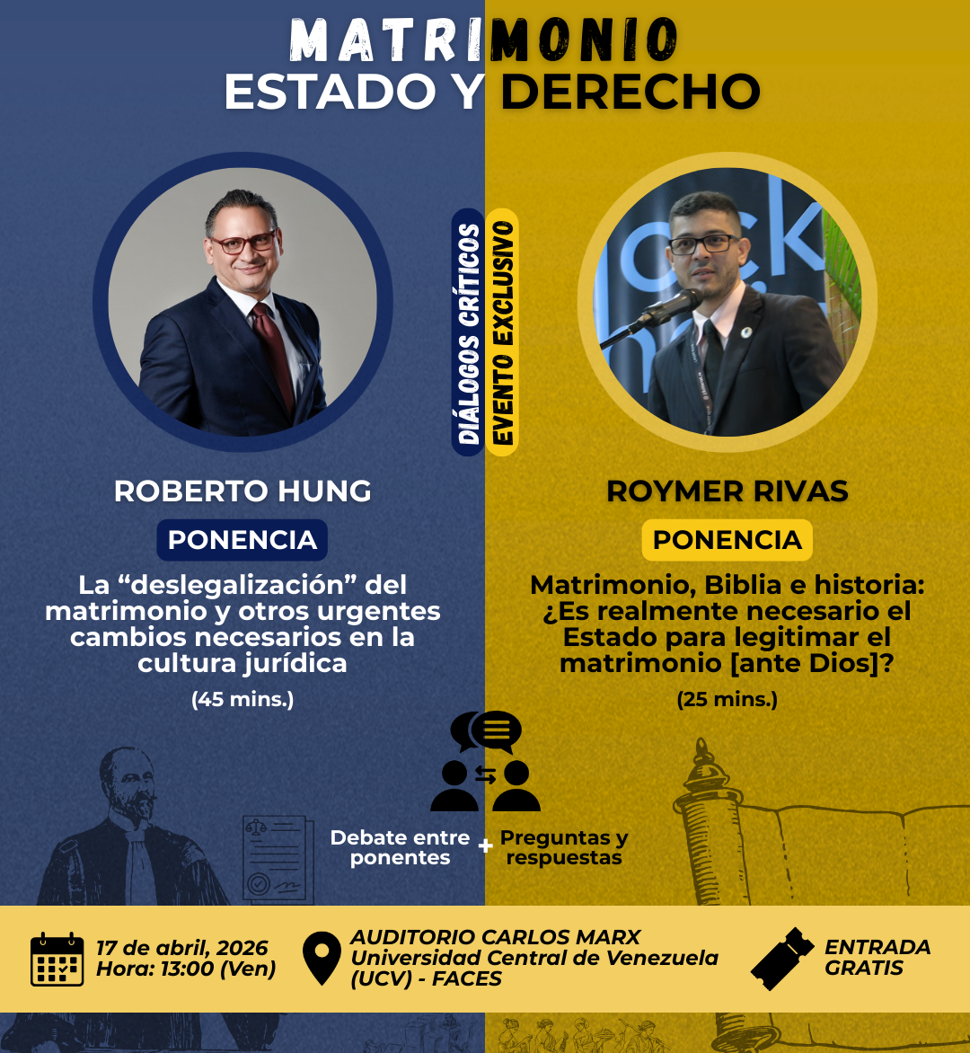 El encuentro, que tendrá lugar en el Auditorio Carlos Marx (FACES) —también conocido como Auditorio Azul— a las 13:00 horas, abordará la premisa de si el matrimonio es una creación puramente legislativa o una institución social preestatal que debería regirse exclusivamente por la voluntad de las partes.