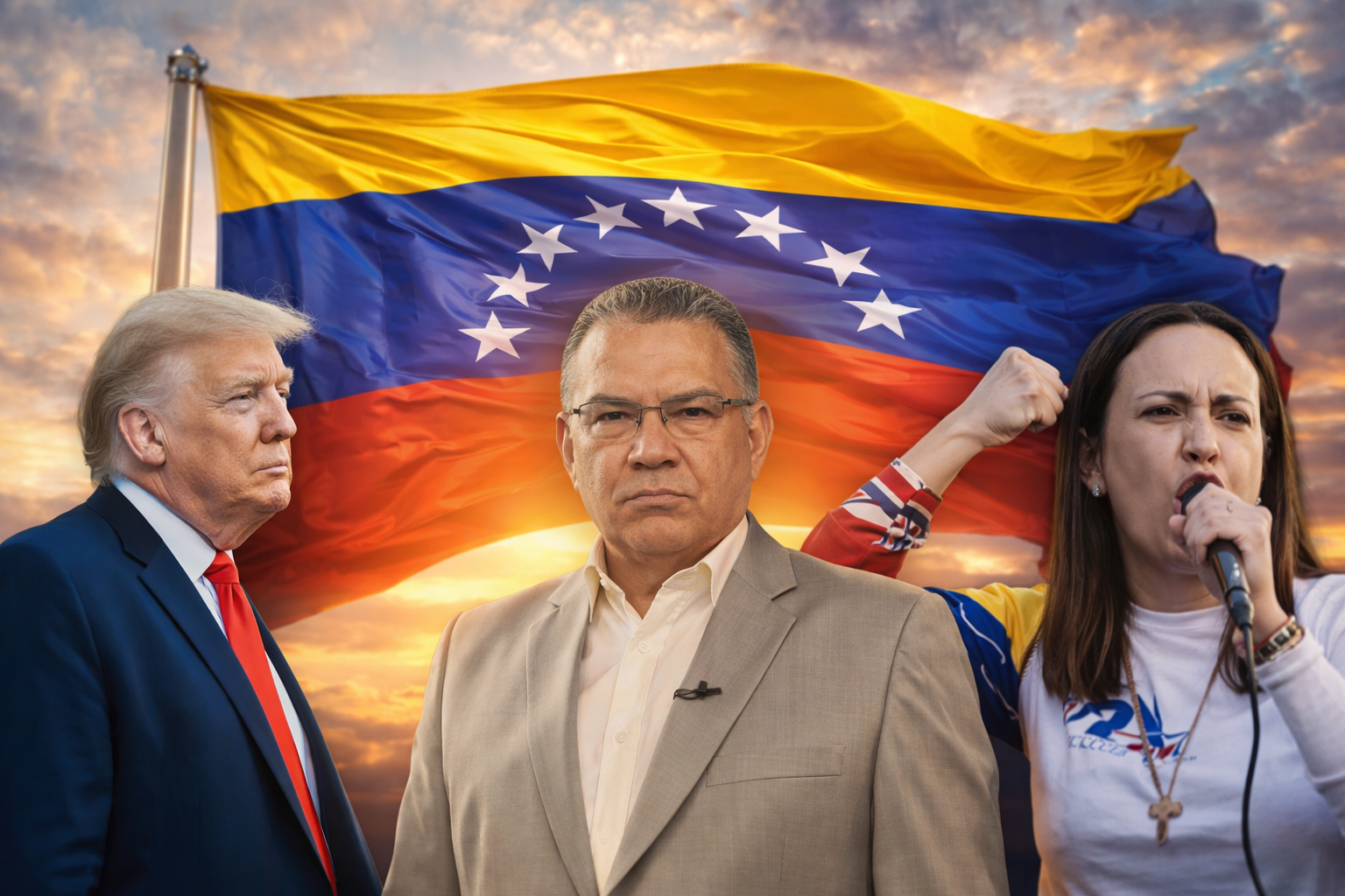 Donald Trump, presidente de EE. UU.; Enrique Marquez, dirigente político comunista de la falsa oposición en Venezuela; y Maria Corina Machado, dirigente de Vente Venezuela