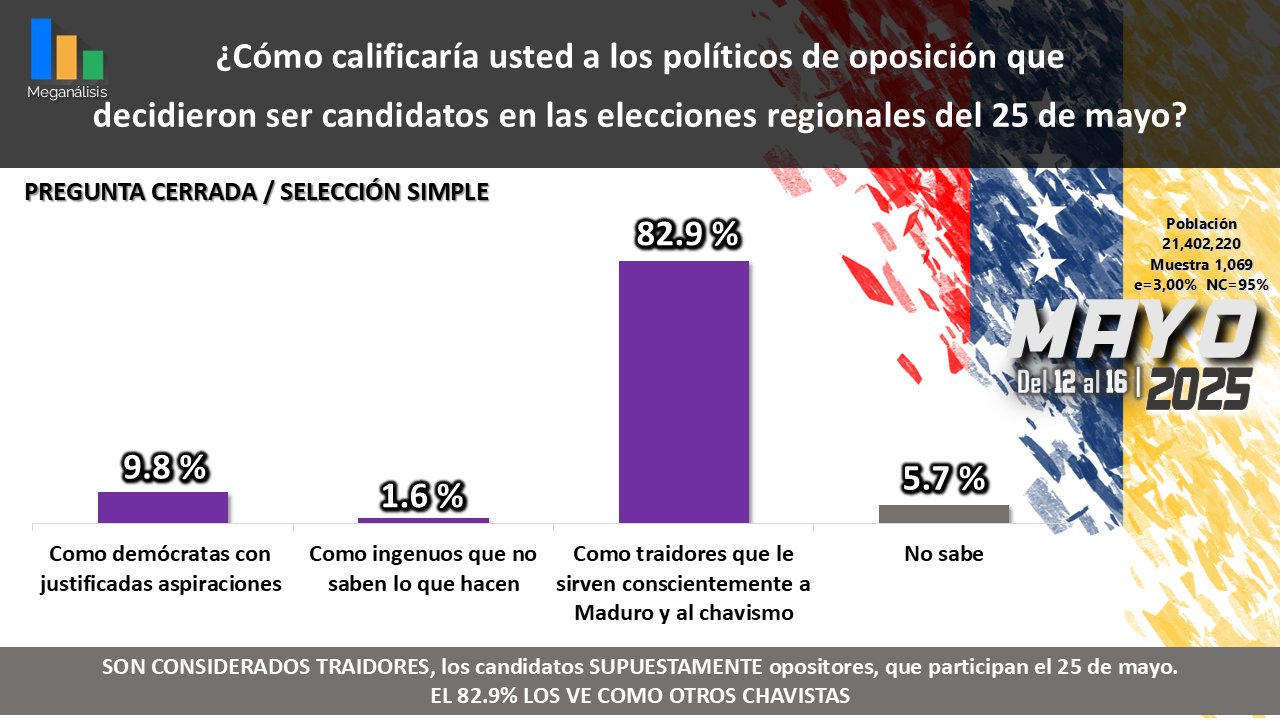 Caracas. – Como traidores a favor del chavismo, califican el 82.9% de los venezolanos a los actores políticos que se prestan para participar en la farsa electoral del próximo 25 de mayo, según el más reciente sondeo de la encuestadora Meganálisis.