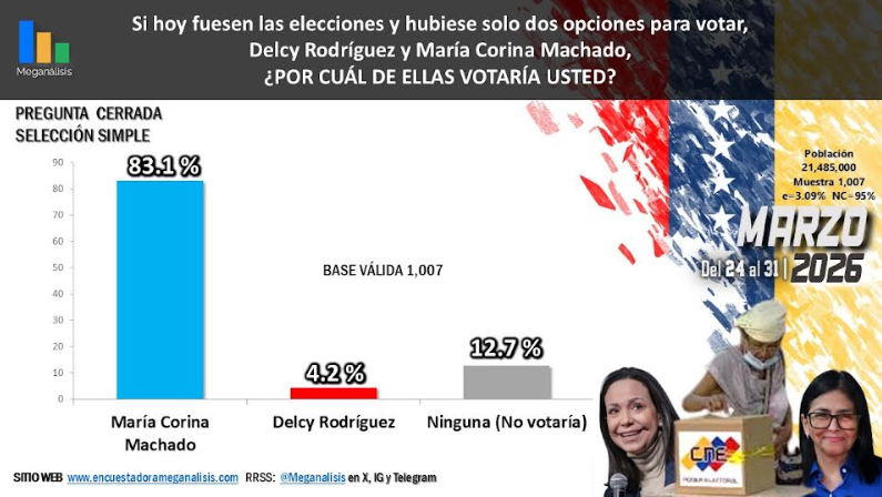 Por su parte, Delcy Rodríguez, quien ejerce funciones como encargada del narcorégimen tras la detención de Nicolás Maduro en enero, obtuvo únicamente un 2,7% de apoyo en el escenario de voto abierto, mientras que un segmento considerable de los encuestados —cerca de 16,6%— optó por no responder.