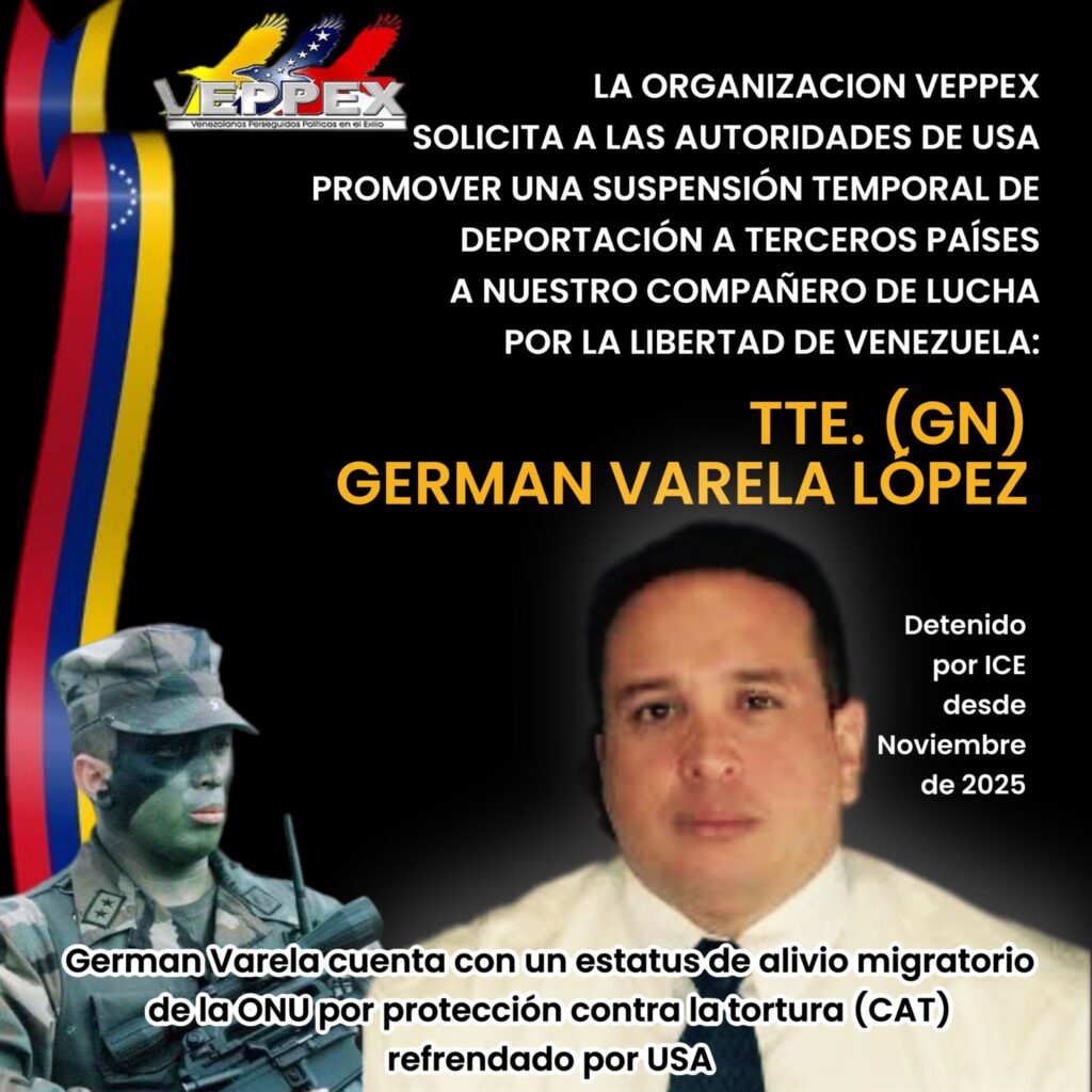 La organización de Venezolanos Perseguidos Políticos en el Exilio (Veppex) señala que el ciudadano Germán Rodolfo Valera López se encuentra bajo la custocia de ICE desde noviembre del años 2025, y temen por su deportación ya que eso podría poner en riesgo su seguridad personal.