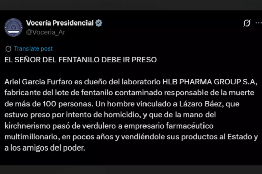 Horas antes, Presidencia había difundido un comunicado titulado “El señor del fentanilo tiene que ir preso”, donde se detalló el accionar oficial en la causa. Allí se recordó que García Furfaro, vinculado a Lázaro Báez y con antecedentes penales por intento de homicidio, pasó de verdulero a empresario farmacéutico multimillonario durante el kirchnerismo, vendiendo medicamentos al Estado sin controles sanitarios.
