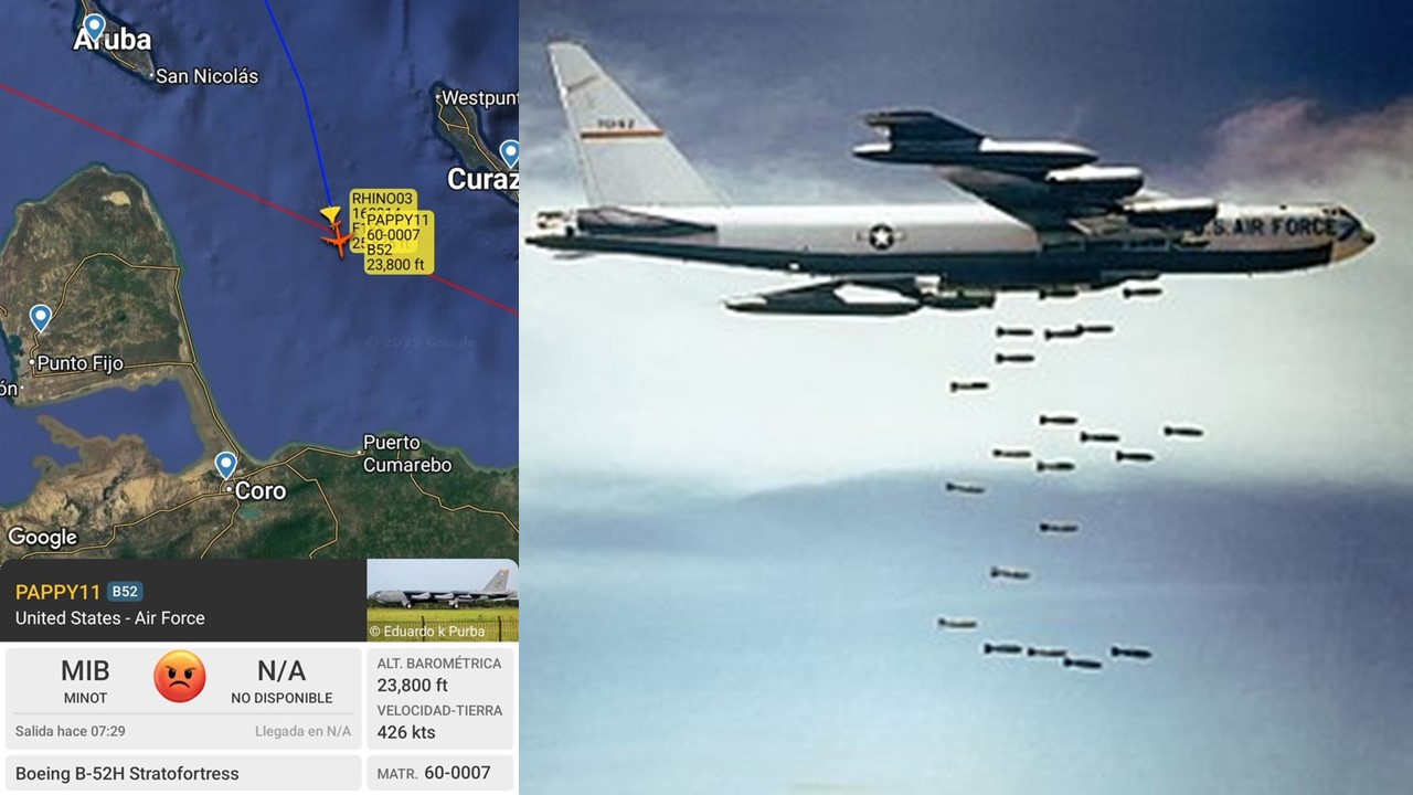 Al ingresar al Golfo de México, los B-52H activaron modo cerrado y continuaron hacia el Caribe venezolano, y luego, de forma paralela, despegaron tres aviones de reconocimiento y un dron MQ-9A desde Florida y Puerto Rico.
