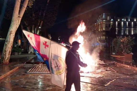 Durante las protestas del sábado, los manifestantes irrumpieron en el patio del Palacio Ceremonial de Georgia —sede de la Presidencia—, en Tiflis, pero fueron inmediatamente rechazados por efectivos antidisturbios.