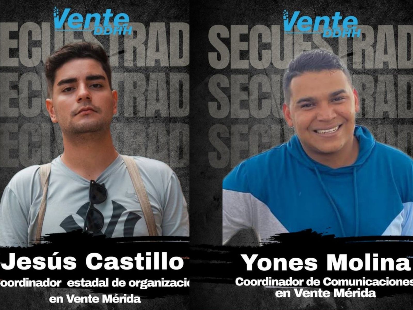 Caracas. – El partido Vente Venezuela denunció este pasado lunes el secuestro de sus coordinadores Yones Molina y Jesús Castillo en el estado Mérida por parte de esbirros del narcorégimen chavista.