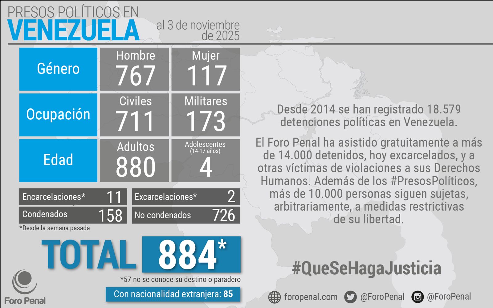 En el reporte, publicado en la red social X y cuyo corte se hizo hasta el pasado 3 de noviembre, Foro Penal detalló que entre los detenidos hay 767 hombres y 117 mujeres. El listado especifica que 880 son adultos y cuatro adolescentes de entre 14 y 17 años.