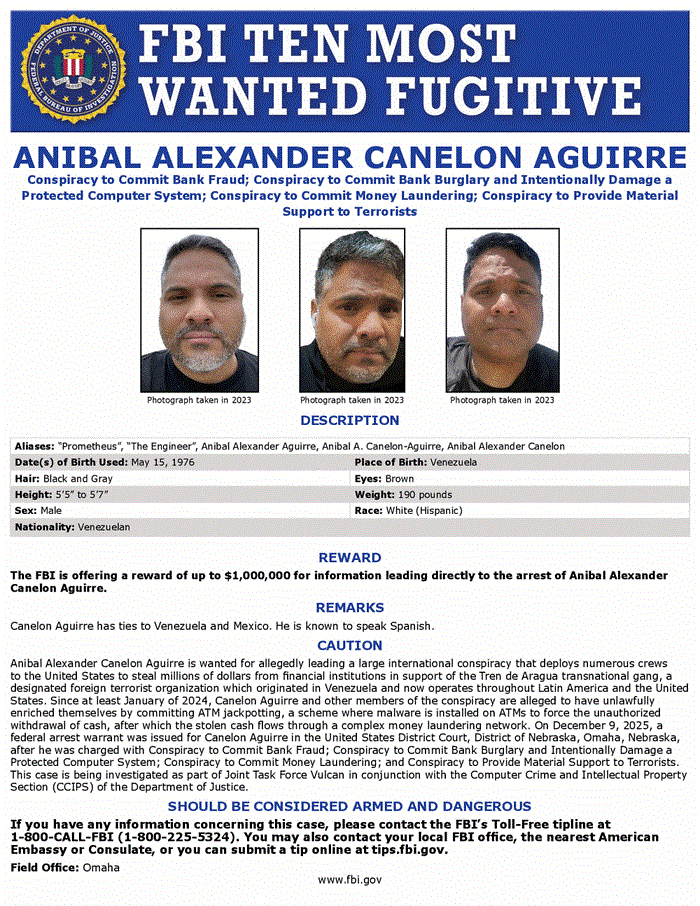 «Desde al menos enero de 2024, Canelón Aguirre y otros miembros de la conspiración presuntamente se han enriquecido ilícitamente mediante la comisión de jackpotting en cajeros automáticos, un esquema en el que se instala malware en los cajeros automáticos para forzar la retirada no autorizada de efectivo, tras lo cual el dinero robado fluye a través de una compleja red de lavado de dinero. El 9 de diciembre de 2025, se emitió una orden de arresto federal contra Canelón Aguirre en el Tribunal de Distrito de los Estados Unidos, Distrito de Nebraska, Omaha, Nebraska, tras ser acusado de conspiración para cometer fraude bancario; conspiración para cometer robo bancario y dañar intencionalmente un sistema informático protegido; conspiración para cometer lavado de dinero; y conspiración para brindar apoyo material a terroristas», detalla la acusación formal publicada por el FBI en su web.